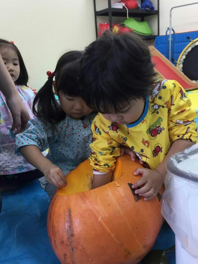 カブクラスは一緒にサークルタイムに参加していただき、紙粘土に色を付けて飾りには色付けしたハロウィンのカボチャの種で素敵なペン立てを作りました。